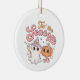 Halloween Tis the Season ornement en céramique de style rétro avec du texte coloré, un citrouille mignon, et un fantôme portant un casquette sorcier.