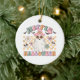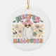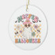 Joli, coloré, amusant Hippie Halloween ornement céramique dispose d'un fantôme hippie avec casquette de sorcière rose, texte qui lit Hippie Halloween, et quelques fleurs et petites chauves-souris et crânes en lavande, melon, aqua, et rose!