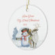Bébé 1er ornement photo de Noël avec un mignon bonhomme de neige et rennes devant un cabine chaud dans la neige. Le modèle est prêt pour vous à modifier le texte sur le devant et ajouter votre photo préférée sur le dos. La photo est affichée en forme de carré, donc si vous avez des problèmes de placement essayez de recadrer votre photo sur un carré et de la recharger.