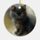 Chaque arbre de Noël a besoin d'un chaton, n'est-ce pas ? Ce tableau présente un adorable chaton noir à la fourrure molle et moelleuse. Elle est assise dans une pose sereine, comme pour calculer son prochain déplacement. Ses yeux verts brillent de curiosité alors qu'elle étudie son environnement. L'arrière - plan de la peinture est un gris doux et muet mélangé au jaune/vert, ce qui aide à mettre en valeur son manteau foncé. L'ensemble est un effet d'innocence, de jeu et de charme, ce qui en fait un doux ajout à n'importe quelle pièce.
