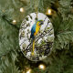 Un macaw bleu et or décore ce joli ornement en céramique toute occasion