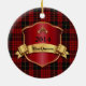 Colorful plaid ceramic ornament, with the traditional red, black, and yellow clan MacQueen tartan plaid pattern, as a background. Graphics of a red and gold tone shield like plaque, has custom black text ready to personalize. Great looking family heirloom ornament. Makes a great vend ornament and decoration for other uses around the house.