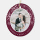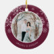 L'élégant ornement de Noël pour les jeunes mariés présente une photo mariage préférée de chaque côté, encadrée de flocons blancs sur un arrière - plan de prune bordeaux. Personnalisez avec une légende personnalisée de chaque côté ; avec "Merrily Ever After" sur l'avant et vos noms sur l'arrière.