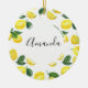 Un ornement avec un mignon motif de citrons jaunes avec des feuilles verts et des tranches de citron fraîchement coupé. Un cercle blanc superposé avec votre texte à l'intérieur.