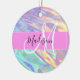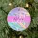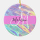 Nom monogramme irisé holographique rosé, pêche et aqua, et ornement céramique initial. Votre nom personnalisé et votre monogramme sont écrits dans un élégant script écrit à la main avec un arrière - plan rose. Un cadeau d'anniversaire ou de Noël parfait !