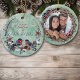 Une belle couronne de branches est ornée de baies rouges, d'arcs à ficelle, de cônes de pins et d'oiseaux d'hiver devant cet élégant ornement modèle photo. L'image de la couronne est placée sur un joli arrière - plan de style bokeh vert sauge, avec des flocons de neige doux tombant tout autour. Au centre se trouve votre texte personnalisé en rouge et vert. L'arrière de l'ornement a votre propre photo encadrée dans une couronne de branche correspondante. Un merveilleux ornement de gardien qui sera chéri au fil des ans!