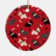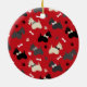 Chiens écossais mignons, noirs, gris et roux, avec des arcs, avec des empreintes et des os de chien sur un arrière - plan rouge.