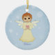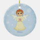 Petit ange mignon tenant un coeur sur un ornement en céramique bleu clair. Le texte peut être personnalisé.
