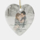Commémorez votre fiançailles avec ce magnifique ornement en forme de coeur. Le texte vert dit "Notre premier Noël engagé", avec le mot "engagé" dans un élégant script d'écriture manuscrite avec des fioritures avant et après. Remplacez l'exemple d'image par votre photo préférée, et ajoutez vos noms et l'année. Un filtre en dégradé blanc permet de faire apparaître le texte.