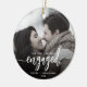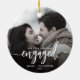 Commémorez votre fiançailles avec ce magnifique ornement de gardien moderne. Le texte blanc indique "Notre premier Noël engagé", avec le mot "engagé" en caractères gras, avec des fioritures avant et après. Remplacez l'exemple d'image par votre photo préférée, et ajoutez vos noms et l'année. Un filtre dégradé foncé permet de faire apparaître le texte.