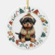 Ce joli ornement de vacances présente une aquarelle d'un adorable chiot Rottweiler habillé en chandail de ski d'hiver et casquette. L'image est encadrée dans une couronne de cercle colorée constituée de diverses images de vacances, dont un bonhomme de neige, des cloches, du sucre de canne, du stockage, du saint, et plus ! L'arrière de l'ornement a la même image de couronne avec votre texte personnalisé en vert, or et rouge.