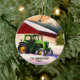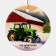 Le tracteur vert préféré d'un fermier est garé devant une grange rouge dans la neige.