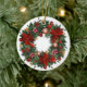 Illustration art numérique d'un ornement de Noël, avec une conception de couronne. La couronne est composée de branches de pin vert, de poinsettias rouges, de baies rouges, de baies dorées et de bonbons rayés rouges et blancs. L'ornement est rond et blanc, avec une corde dorée en haut pour être suspendu. L'arrière - plan est blanc clair. Le style rappelle les décorations de Noël classiques, avec une touche d'art numérique moderne. La palette de couleurs est dominée par les rouges, les verts et les dorés, créant une atmosphère festive et chaleureuse.