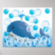 Une baleine bleue douce et heureuse entourée de bulles de savon pour égayer la nurserie ou peut-être où bébé prend son bain.