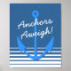 Décoration nautique | Création d'affiche « Anchors aweigh ». Illustration mignonne pour la décoration de maison de plage, chambre d'enfants maritime ou salle de bébé sur le thème. Ancre de bateau à voile bleu clair avec monogramme personnalisé, citation ou nom de bébé garçon. Exemple « Ship Ahoy ! ». Rayures bleu marine et blanc pour la mer plus symbole d'ancre levée. Idée de cadeau de baby shower maritime pour le nouveau-né d'un marin ou d'un navigateur.