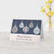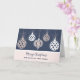 Merry Christmas for cousin and her family card with a modern design with rose gold ornaments and blue background.