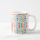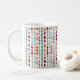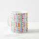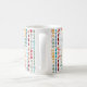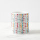 This mug has a mid-century modern design of circles and ovals strung together in retro colours strung together on a field of white.