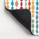 This mouse pad has a mid-century modern design of circles and ovals strung together in retro colours strung together on a field of white.