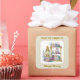 This beautiful watercolor design features flowers, a lantern, and pastel books and vases on a gold antique shelf.