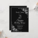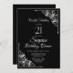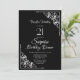 A black and white Surprise 21st birthday dinner invitation featuring ornate lace diagonal corners to frame the white text.