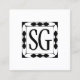 A square business card template with initials placed inside a square box with a decorative frame. In this version the initials are in the Integrity bold font. Name and profession/job title along with telephone, email and website address in black on the reverse side on a white background, using variations of the Matt Antique font.