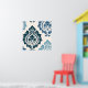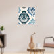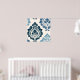 A vintage influenced decorative damask art print in a modern style in mid-blue, dark blue and light blue detail on a light cream color background.