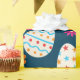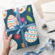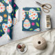 Celebrate spring and Easter with wrapping paper featuring colourful decorative eggs pattern with flowers in pink and orange and green leaves on dark blue background