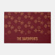A doormat with a repeating pattern of fancy golden snowflakes with elegant crystalline shapes. A dark red background.