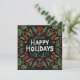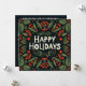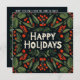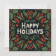 Minimalist holiday card design with a Scandinavian-inspired theme. The card features a simple green and red colour palette, with intricate, stylized illustrations of holly berries and abstract plants, arranged in a harmonious and balanced layout around a central text box. The central box has a clean, modern font with the message "Happy Holidays" The design evokes a natural, festive feel with elegant, hand-drawn details, capturing a modern yet timeless aesthetic.