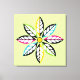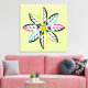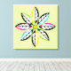 Decorative Leaves-Flower modern, abstract wrapped canvas print design, featuring a flower its petals made of colourful leaves with yellow centre on pale green background. Two of them in black, yellow, two in black, aqua/turquoise, two in black, fuchsia pink and two in black, lime green. In each of them there are smaller white leaves. This abstract nature inspired square print has a retro feel to it and is completely customizable.