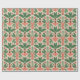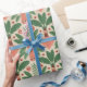 Decorative paper with a pattern of stylized green leaves and pink flowers on a white background, shown rolled and flat. Bright and lively design.