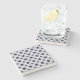 A decorative coaster featuring a symmetrical geometric pattern with blue, white, and brown hues shown from the front and back on a gray background.