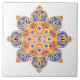 This ceramic tile is an intricate medallion or mandala in Orange and blue on a white background. Use it on your fireplace, backsplash or bathroom for a Bohemian hippy vibe. The design comes from Oregon Tile maker Fay Jones Day
