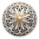Decorative, ornate, floral scrollwork orb that looks 3d with exquisite, fine details. This piece is silver grey, light gold, with grey and black deep shadows. Perfect for an elegant, luxury styles, kitchen cabinets, bathroom, or a fine style on bedroom furniture.