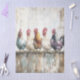 The featured artwork showcases five expressive chickens perched on a weathered wooden fence, each with distinct plumage — from blue-gray and white to reddish-brown and black with purple hues. Set against a whitewashed barnwood backdrop, the design blends country whimsy with artistic texture, ideal for farmhouse, spring, or animal-themed creations.