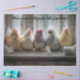 pastel chickens on windowsill, funny farmhouse bathroom art, whimsical chick photo, rustic toilet paper humor, dyed fluffy chickens indoors, cottagecore spring décor, DIY decoupage animal image, surreal farm animal scene, RHDesigns by 2ChattyChicks artwork, humorous poultry craft image