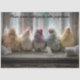 Five pastel-colored fluffball chickens—light brown, white, lavender, light blue, and pale yellow—snuggle together on a rustic windowsill, gazing out a frosty farmhouse window. Scattered bits of tissue and a lone toilet paper roll add a cheeky twist to this surreal indoor scene. Perfect for farmhouse bathroom décor, spring-themed DIY projects, or anyone who appreciates a little poultry mischief with their morning coffee.