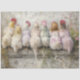 The image shows a row of chickens perched on a ledge, viewed from behind. The chickens have fluffy feathers and are adorned with various colours and patterns, including shades of white, pink, and light blue. Some of the chickens have red combs on their heads. The background is a rustic wall with some greenery and pink flowers, adding a natural and charming aesthetic to the scene. This image is interesting because it combines the natural beauty of chickens with an artistic and whimsical touch, making it visually appealing and unique.