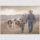 The image captures a serene moment in a rural landscape. A man and his young son walk hand in hand through a field, following three white and brown cows. The man is wearing a cowboy hat, a chequered shirt, jeans, and boots, while the boy is dressed in a brown jacket, jeans, and boots. The cows are moving away from the camera, and the background features a soft, cloudy sky with distant trees. This image highlights the bond between humans and animals, depicting a farming or ranching lifestyle and the peaceful connection to nature scene.