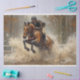 This dynamic artwork captures the exhilarating moment of a rider and horse galloping through water, creating dramatic splashes. The rider, dressed in equestrian attire, and the powerful horse in mid-stride, showcase the energy and grace of horseback riding. The autumnal background, with fallen leaves and bare trees, adds a seasonal charm to the scene. “Galloping Through Autumn” beautifully blends the thrill of equestrian sports with the serene beauty of nature.