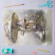 This enchanting digital painting features a whimsical mushroom house adorned with delicate gold filigree, blooming flowers, and intricate details that evoke a fairytale charm. The soft hues of lavender, ivory, and pastel pink create a dreamy atmosphere, making it look like a cozy dwelling for magical creatures. A tiny, ornate staircase leads up to the warmly lit entrance, while charming teacups and decorative elements add to the fantasy-inspired aesthetic. Surrounded by lush wildflowers and mossy textures, this piece beautifully blends nature and imagination into an ethereal scene.
