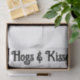 The image is a detailed black and white sketch of a piglet with a content expression, leaning over a wooden fence. The piglet's eyes are closed, and it appears to be smiling. The piglet's front hooves rest on the top of the fence. The text "Hogs & Kisses" is written over the piglet's head. This charming illustration combines the endearing depiction of a piglet with a playful pun, making it perfect for use in greeting cards or similar contexts