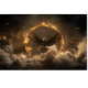 The image showcases a majestic eagle with its wings fully outstretched, placed dramatically at the centre of a glowing, fiery ring. The background is dark and filled with swirling smoke and debris, creating an intense and dynamic atmosphere. Surrounding the eagle, several smaller birds are seen in flight, adding movement and life to the composition. The intricate details of the eagle's feathers and the radiant golden hue of the fiery ring contrast sharply with the dark, smoky backdrop, making the scene both powerful and visually striking.