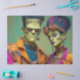 This electrifying pair brings monster love into the modern age with steampunk swagger and pop art punch. The Hot & Haunted couple rocks a stitched-up scowl, square head, and distressed orange jacket with metallic flair. His bride? A vision of cyber-chic confidence—purple and blue hair styled sky-high, steampunk goggles perched like a crown, and a high-collared outfit that screams fierce and fabulous.