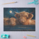 Two shaggy Highland sweethearts rest their heads on a hay-filled blue trough, bathed in moonlight and surrounded by stars. Their peaceful gaze and cozy pose turn this rustic moment into pure magic. With a full moon glowing above and a cosmic sparkle in the air, this scene blends barnyard charm with celestial serenity. It’s a quiet night, a tender bond, and a reminder that even under the stars, love finds its way to the hay bale.