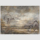 The image depicts a rustic rural scene featuring an old windmill and a weathered barn. The windmill, with its large, circular blades, stands prominently on the left side of the image. The barn, which appears aged and worn, is situated on the right side. In the foreground, there are two cows grazing in a field. The background includes trees and a cloudy sky with birds flying. The overall atmosphere is serene and nostalgic, capturing the essence of countryside life.