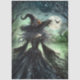 A powerful witch stands beneath the full moon in a shadowed forest, her flowing black gown adorned with lace and embroidery. Her pointed hat, decorated with flowers and feathers, adds a touch of elegance to her eerie silhouette. Wind catches her long, silver hair as bats swirl across the moonlit sky. Mist rises from a distant body of water, casting greenish hues across the leafless trees. This haunting scene blends beauty and mystery, perfect for dark fantasy storytelling, Halloween decor, or gothic-inspired branding.