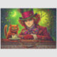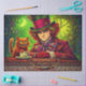 A mysterious crimson timekeeper sits at an enchanted tea table beside a mischievous grinning cat, surrounded by swirling fantasy colors and a glowing clock in the background. Rich jewel tones, ornate patterns, and vibrant storybook details create a surreal tea party atmosphere where time itself seems to bend. This whimsical fantasy artwork captures the playful magic of enchanted tea gatherings and imaginative storybook worlds, making it perfect for collectors of surreal fantasy art, whimsical décor, and magical tea party themes