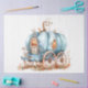 A beautiful fairy tale-inspired pumpkin carriage, painted in a soft blue with intricate metalwork forming elegant swirls and leaf patterns. The carriage, adorned with beads, rests on wooden wheels with orange accents, adding a touch of whimsy. Surrounding the carriage are falling autumn leaves, enhancing the magical and seasonal atmosphere. This image beautifully combines elements of fantasy and autumn, making it perfect for themes related to fairy tales, children’s literature, or seasonal decorations. “RHDesigns by 2chattychicks” is the creators of this delightful piece.