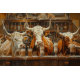 The image showcases a humourous scenario where four cows are seated at a bar, each enjoying different beverages including milk, wine, and beer. The cows are behind a wooden bar counter, surrounded by shelves lined with bottles and glasses. The scene is set in a rustic bar, creating a playful and imaginative environment.
